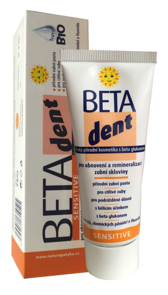 Naravna zobna pasta BETADENT z beta glukanom je izdelana posebej za potrebe občutljivih zob in razdraženih dlesni. Občutljivost zob je posledica poškodovane in oslabljene zobne sklenine ali razgaljenja zobnega vratu, kar pogosto spremljajo tudi vidna orumenitev zob. Kompleksna naravna zobna pasta BETADENT krepi stanjšano zobno sklenino in popravlja mikroskopske poškodbe v njenem površinskem in podpovršinskem sloju, s čimer pomaga preprečevati nalaganje zobnega kamna in nastanek kariesa ter hkrati zobem vrača prvotno belino. Fina sestava zobne paste BETADENT zobe nežno in temeljito očisti, nudi olajšanje pri težavah s povišano občutljivostjo zob in spodbuja naravno obnovo razdraženih dlesni, jih ščiti, pomirja in neguje.